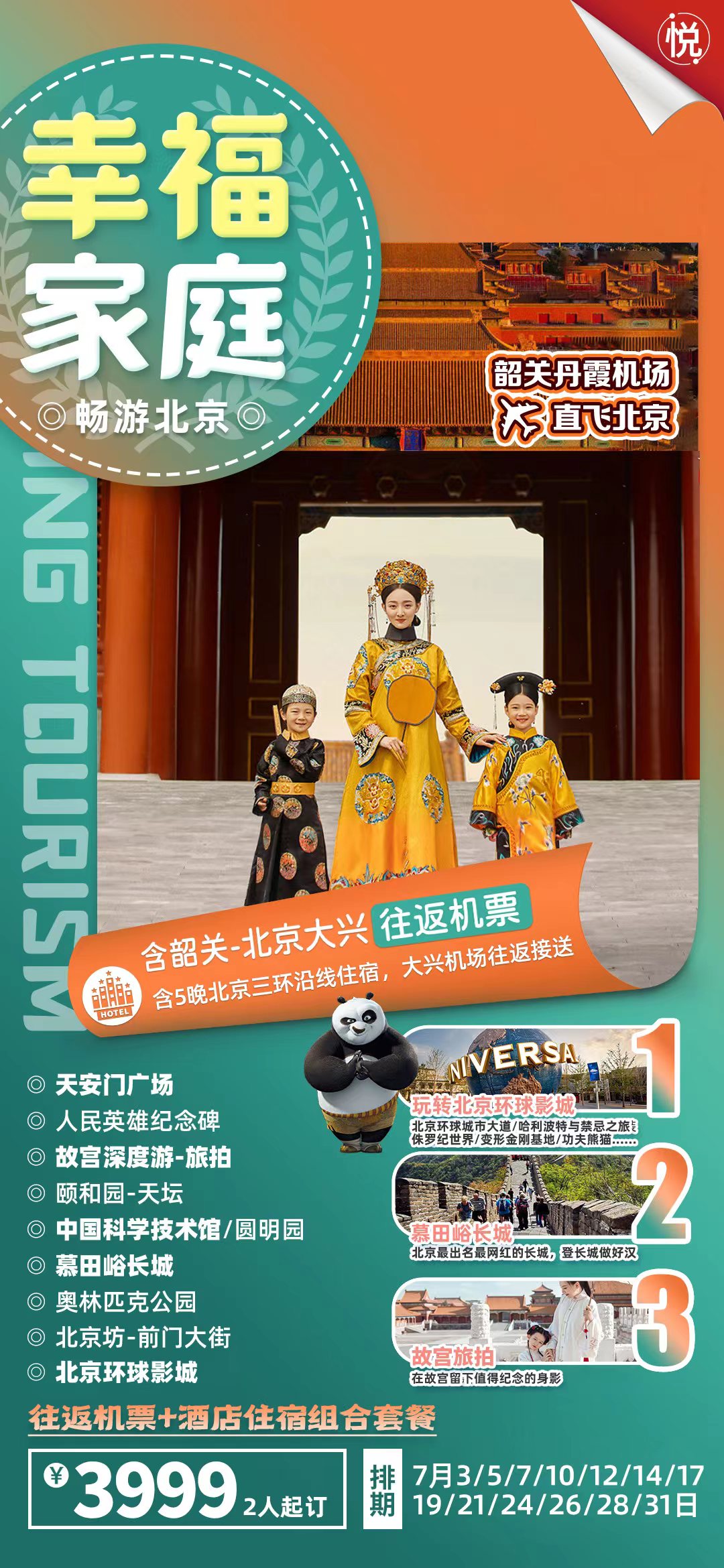出發(fā)日期:7月31日,8月2、4、7、9、11、14、16、18、21、23、25、28、30日均可預(yù)定,實(shí)惠的旅游團(tuán)隊(duì)機(jī)票+實(shí)惠的團(tuán)購酒店組合;附帶贈送大興機(jī)場往返酒店的接送服務(wù);向往的北京自由行之旅+實(shí)惠的旅游團(tuán)隊(duì)價(jià)格的結(jié)合,精明的你值得擁有;
